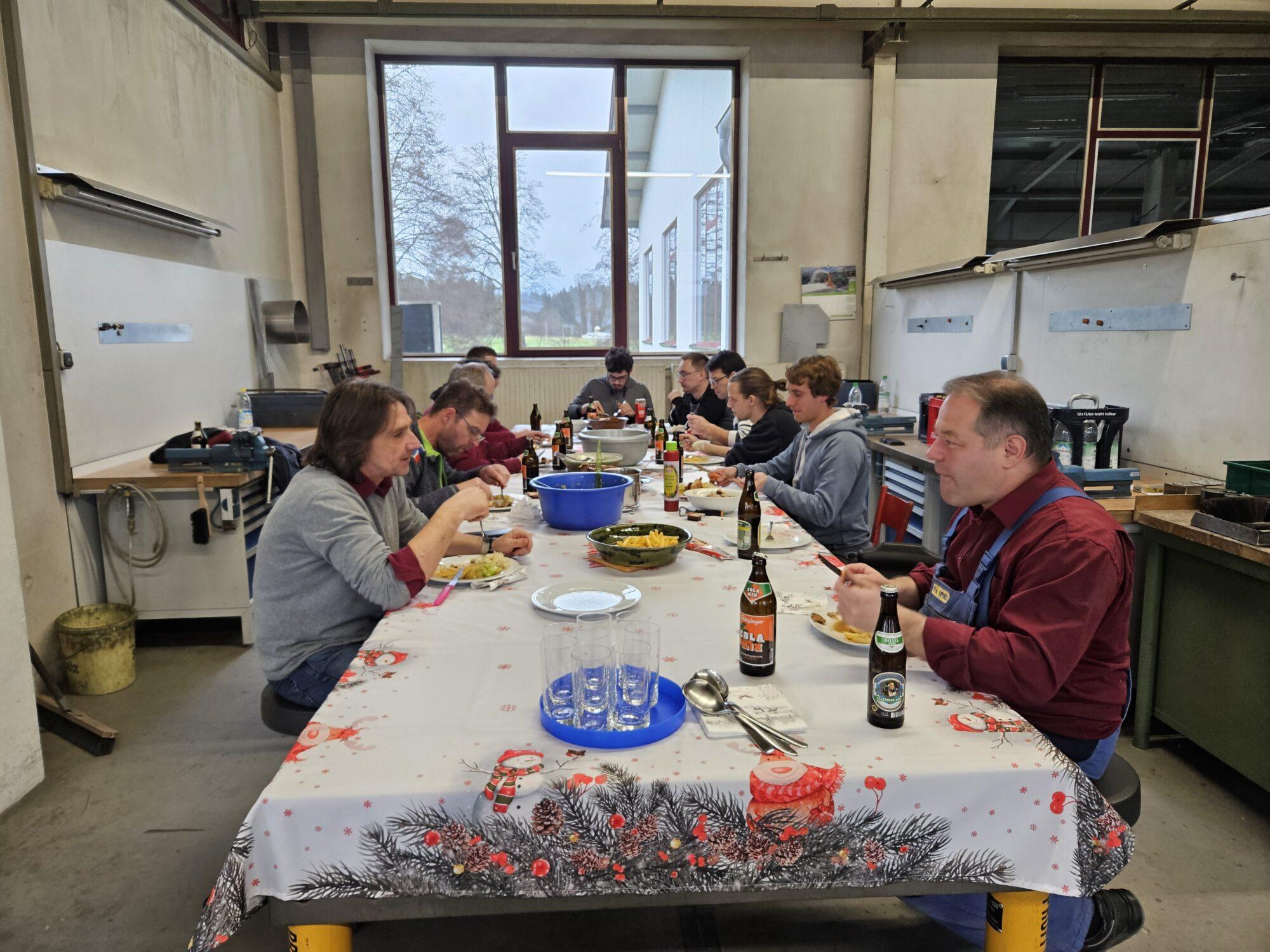 Am letzten Arbeitstag vor unserem Betriebsurlaub – nach dem großen Putzen – wird das Team vom Chef immer noch lecker bekocht und zusammen lassen wir den Tag ausklingen und freuen uns auf die Weihnachtszeit.